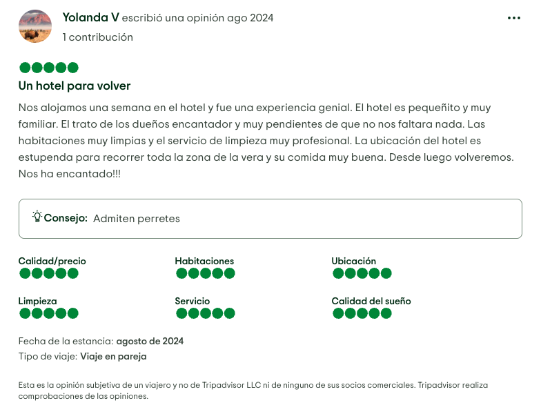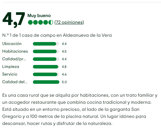 Opinión en TripAdvisor. Nota media 4,7 /5